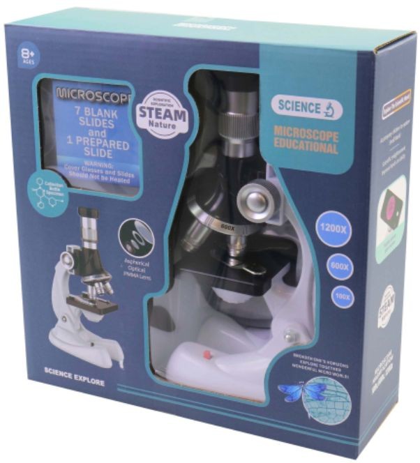 - Mikroskop je dodáván s okny pro snadné pozorování a vyžaduje 2 baterie typu AA, které nejsou součástí balení.