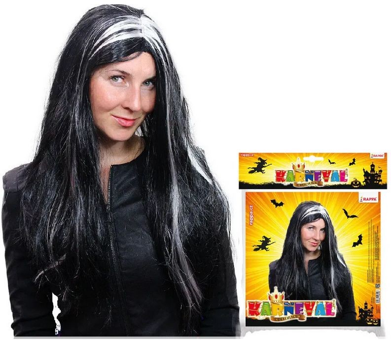 - Paruka má dlouhé černé vlasy a je dekorována stříbrným melírem.