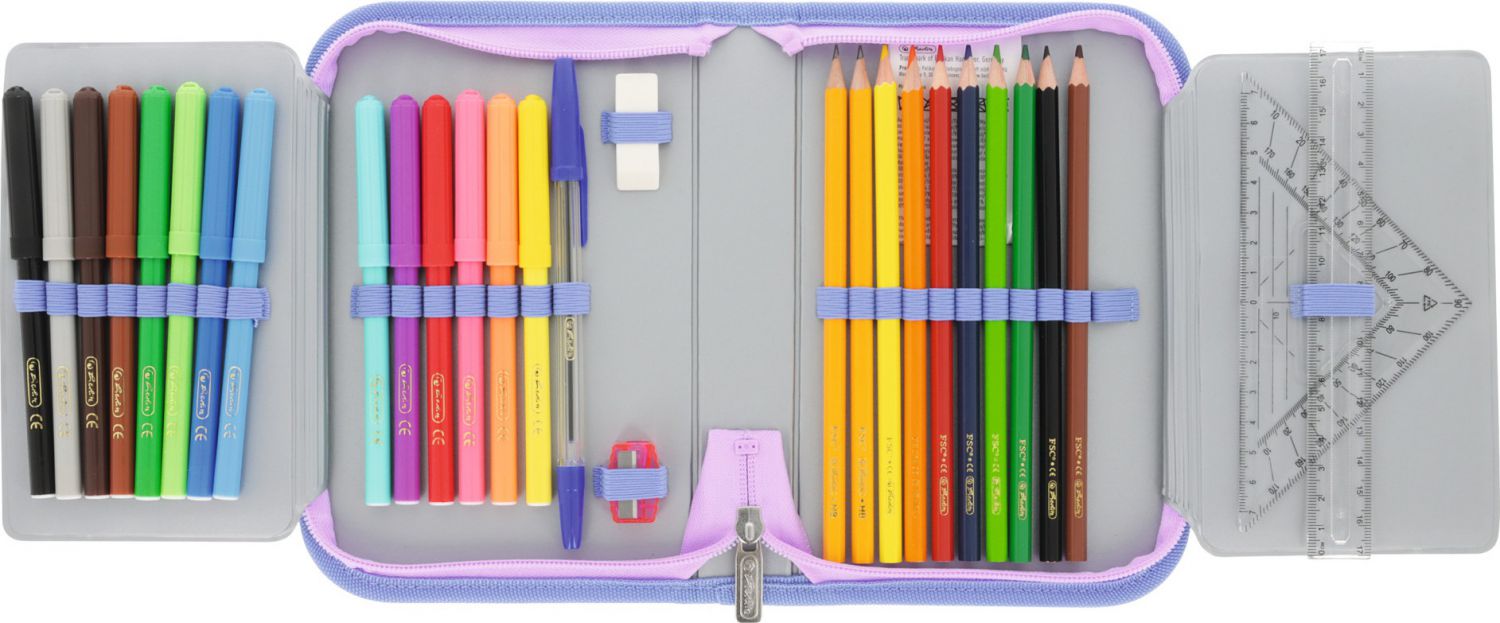 - 31 dílů - 14 fixů, 8 šestihranných pastelek, 2 tužky, ořezávátko, guma, 16 cm pravítko, trojúhelník, kuličkové pero, rozvrh hodin, vizitka,