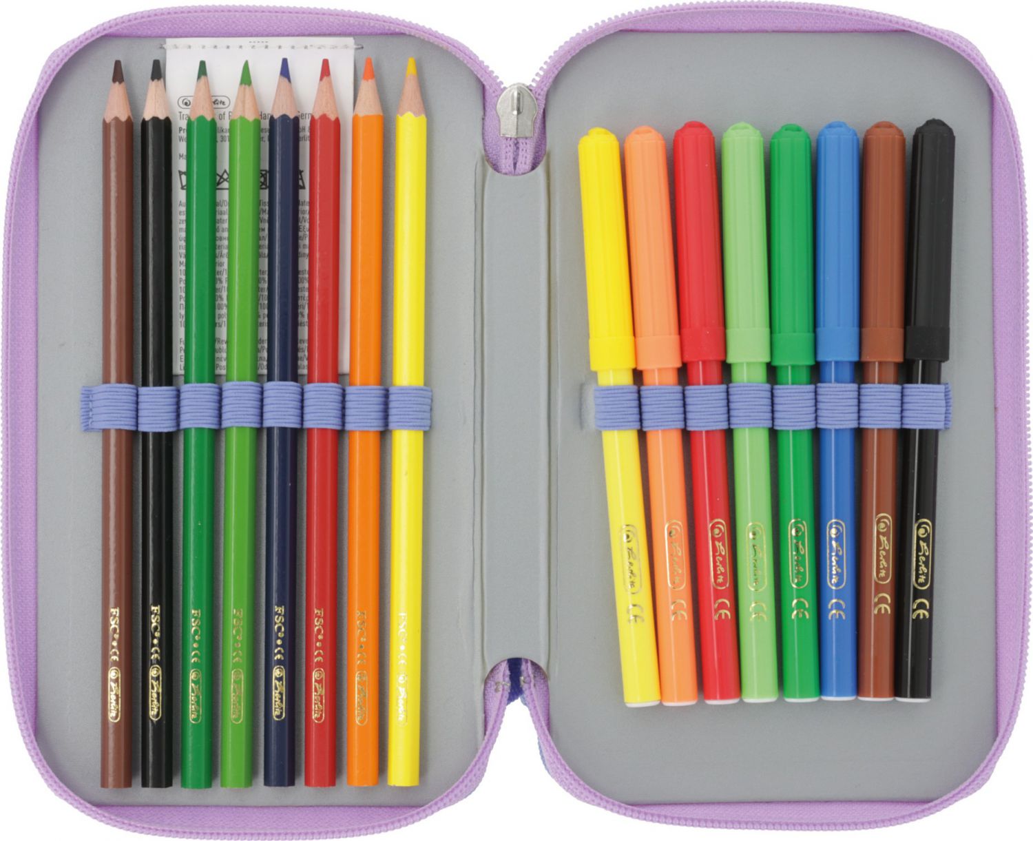 - 23 dílů - 8 fixů, 8 pastelek, 2 tužky, ořezávátko, guma, kuličkové pero, 16 cm pravítko, trojúhelník,