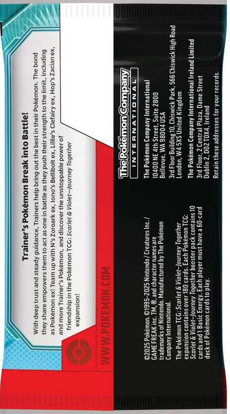 - Journey Together - ve světě Pokémon TCG je pouto mezi trenérem a jeho Pokémonem klíčem k vítězství. V tomto rozšíření zažijete, jak hluboké pouto a vzájemná důvěra umožňují Pokémonům ex, jako jsou Zoroark ex N a, Bellibolt ex Iono, Clefairy ex Lillie a Zacian ex Hop a, dosáhnout dříve nemožných úrovní síly. Připravte se na napínavé souboje a objevte sílu přátelství!