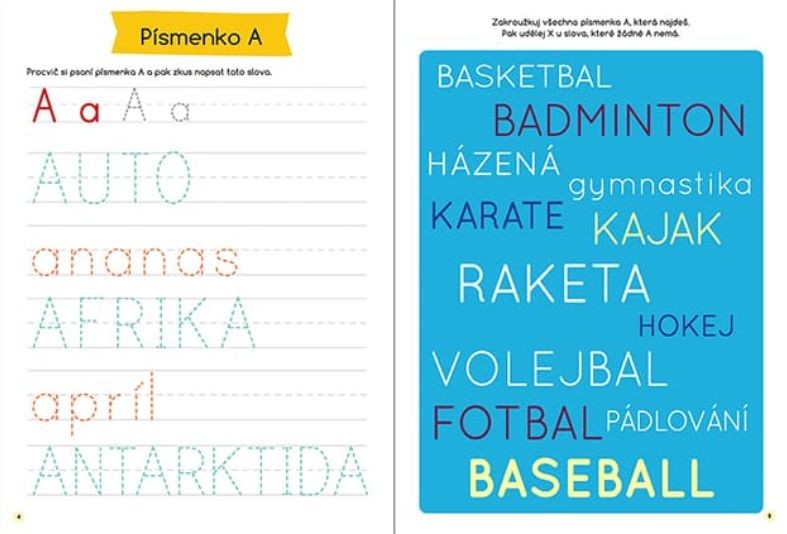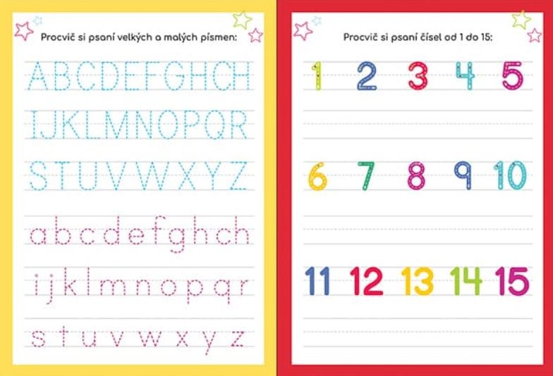 - Velká cvičebnice obsahuje 120 stran předškolních a školních aktivit a 2 stíratelné tabule k procvičování psaní písmen a čísel.