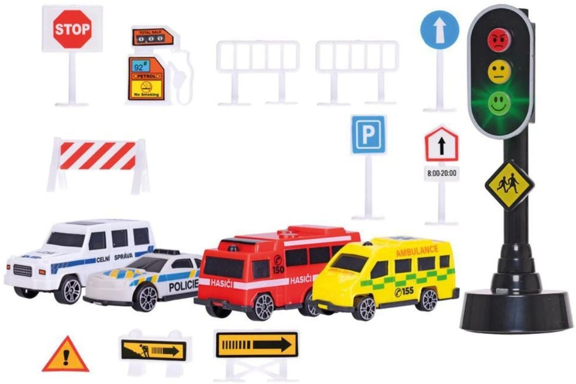 Informace o zboží Sada 4 ks aut 7 cm s dopravními značkami a semaforem na baterie se světlem