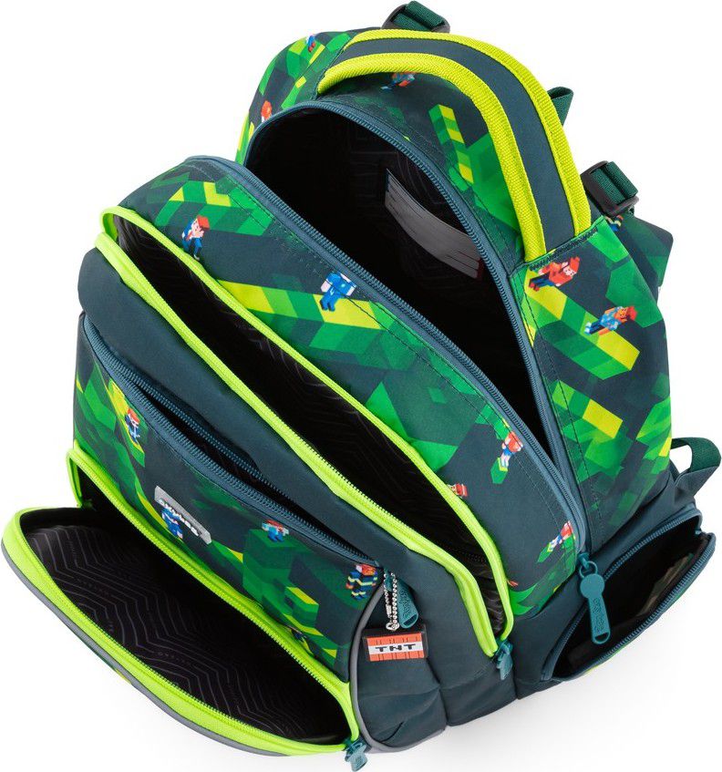 - Přidané háčky umožňují uchycení dlouhých popruhů. Vnitřní kapsy nabízí dostatek místa na učebnice, sešity i další potřeby, pevné nepromokavé dno chrání obsah před ušpiněním a protečením.