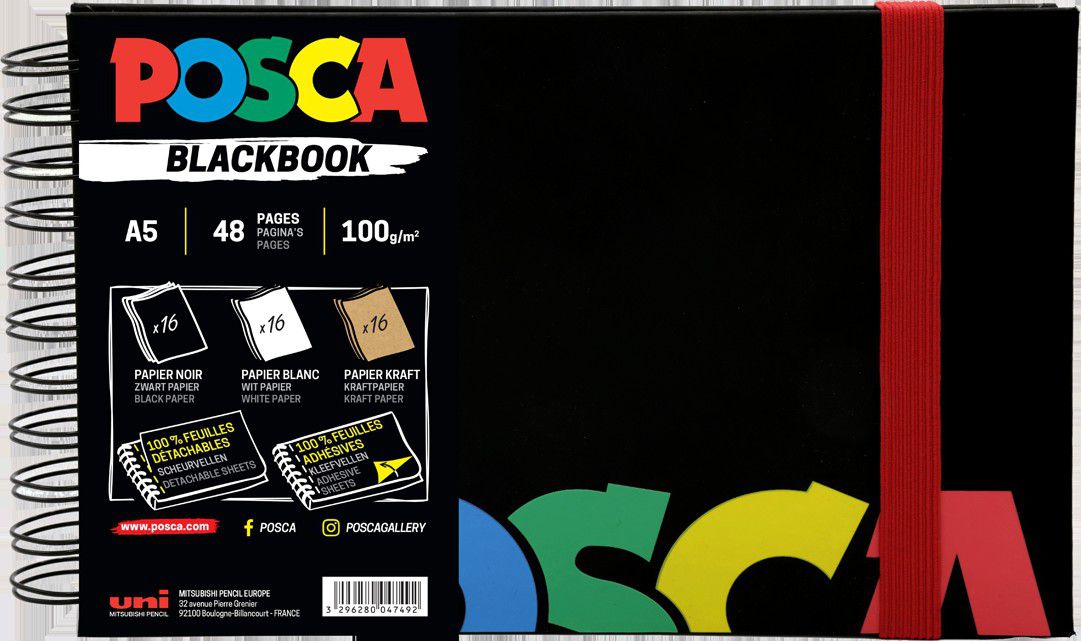 Skicák POSCA má pevné matně černé desky s barevným logem POSCA a širokou červenou gumičkou chránící skicák před otevřením. Sami si můžete zvolit podklad podle příležitosti, situace nebo nálady. K dispozici je 16 černých, bílých a přírodních stránek v barvě kartonu. Kroužková vazba zajistí snadné listování a perforace jednoduché vytržení listu. Skicák lze díky své velikosti uložit i do menší tašky nebo kabelky. Zadní strana listu je samolepicí a umožňuje tak přenesení hotového díla mimo skicák.