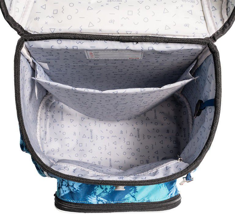 - VNITŘNÍ USPOŘÁDÁNÍ – prostorná hlavní vnitřní komora je rozdělená látkovou přepážkou pro uložení boxu na sešity či knih. Součástí hlavní komory je také kapsička pro uložení drobností, odepínatelný kroužek na klíč a štítek na jméno a adresu. Ve víku je průhledná kapsička na rozvrh hodin