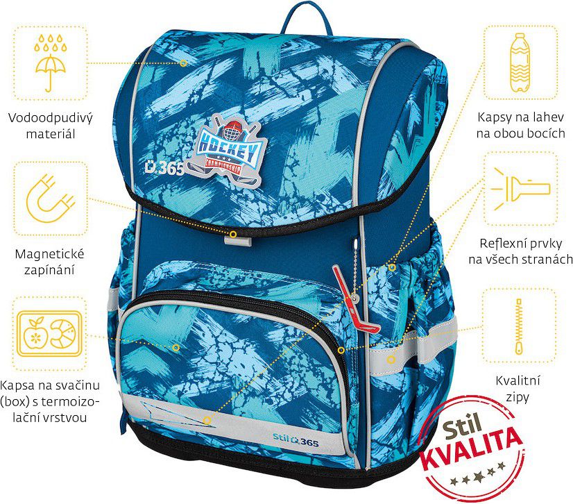 Školní aktovka potěší nejen praktickým provedením, ale i možností obměny designu. Je doplněna přívěskem ve tvaru hokejky a dvěma vyměnitelnými aplikacemi na suchý zip. Další aplikace na suchý zip si u nás můžete dokoupit a vytvořit tak originální aktovku na míru.