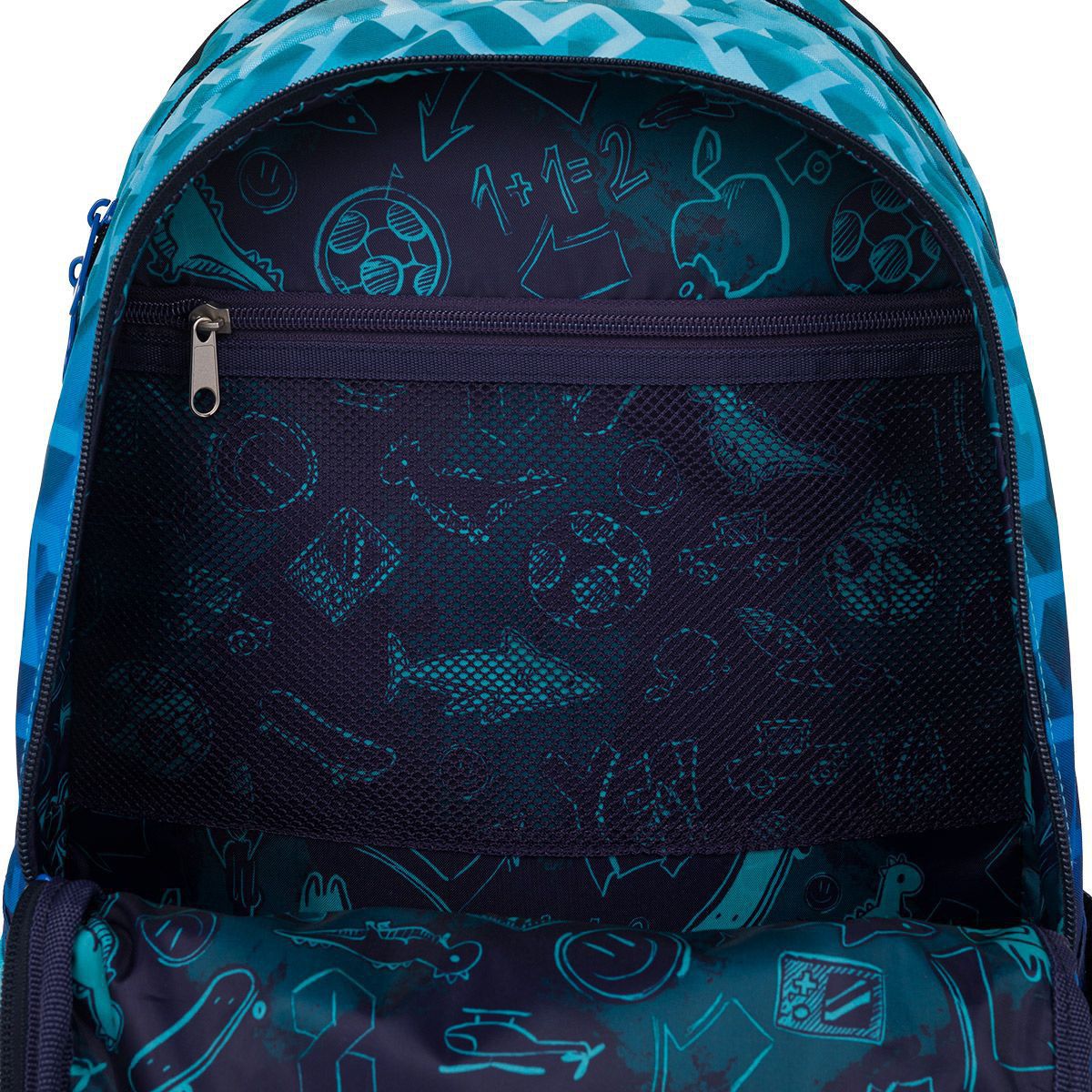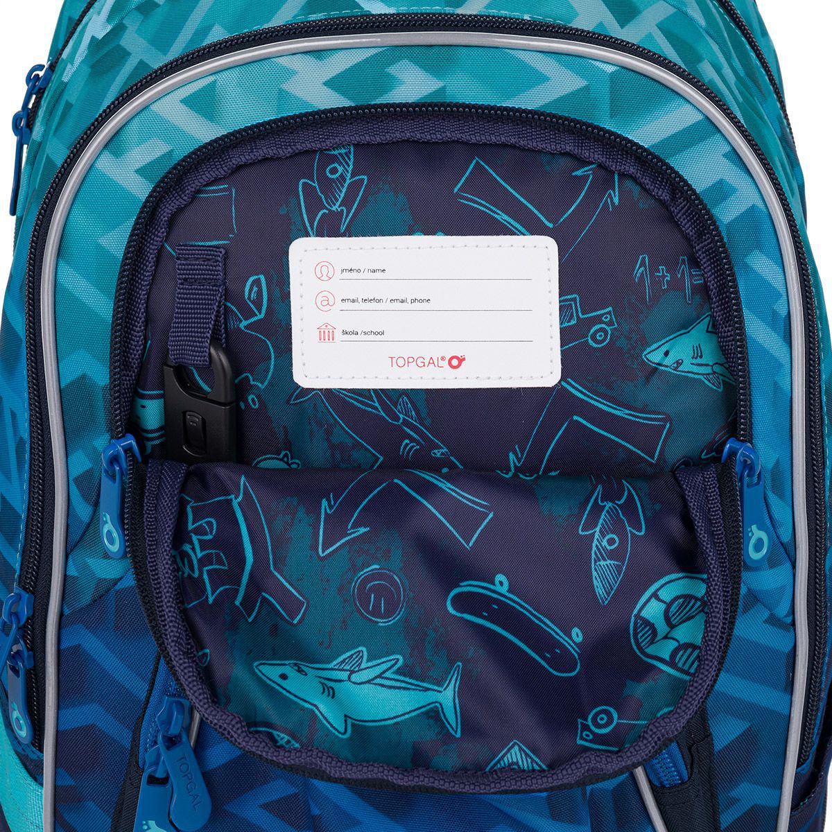 Zadní komora batohu je ideální na přenášení nejtěžších učebnic nebo desek na sešity. Do přední komory jsme přidali praktickou síťovou kapsičku na zip, třeba na doklady. Hluboká kapsa mezi přední komorou a kapsou na čele batohu má užší vstup, proto se skvěle hodí pro PENN 25017 ve stejném designu nebo krabičku na svačinky.