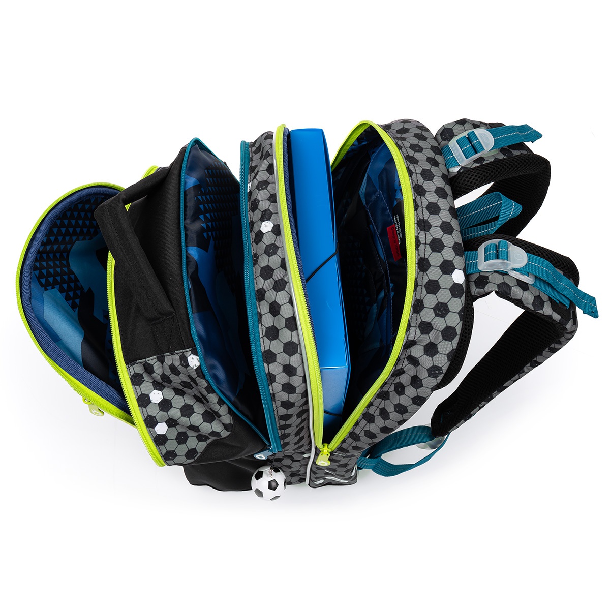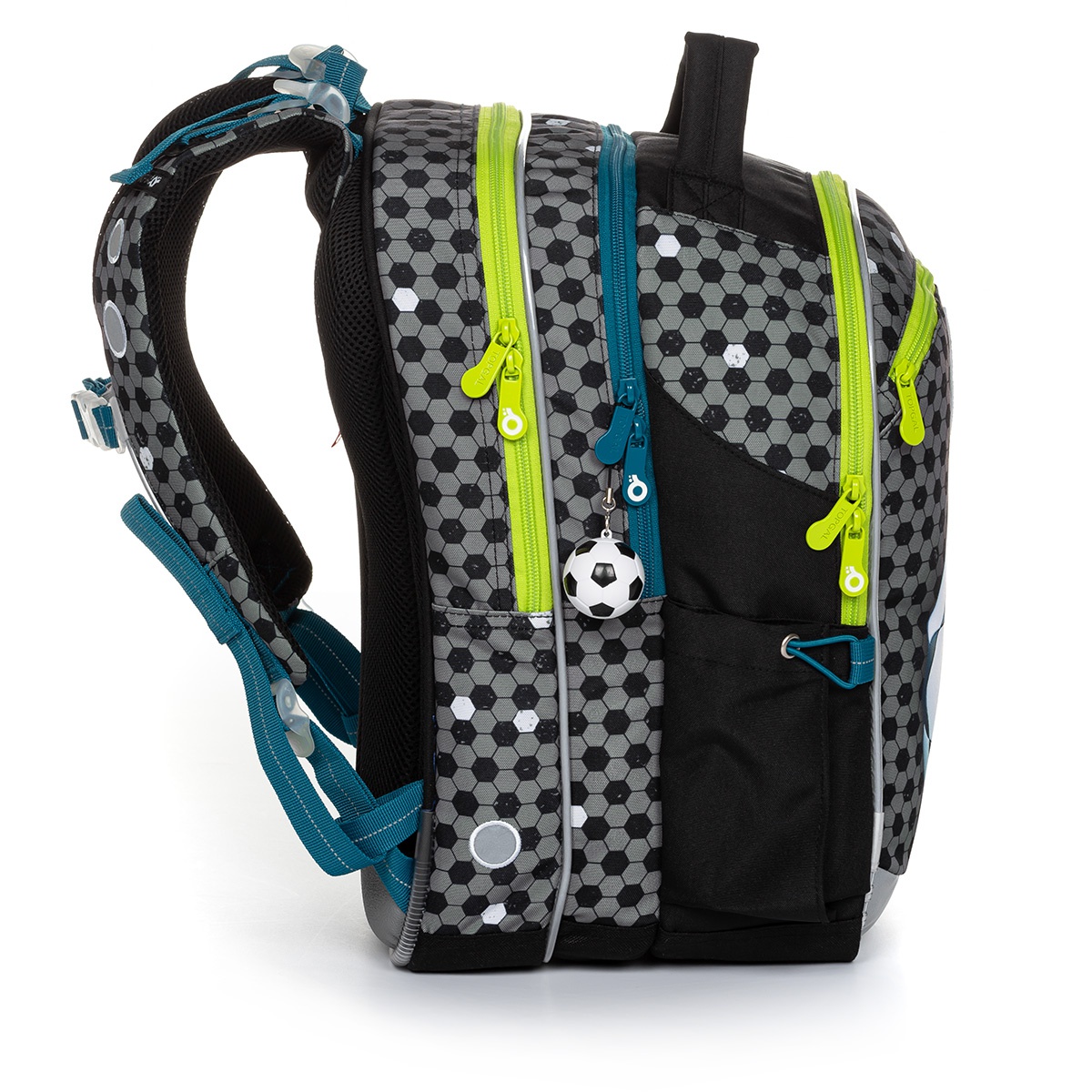batoh s motivem fotbalového míče, hlubokou přední kapsou a třemi komorami – prostě hattrick pro všechny školáky na prvním stupni ZŠ!
