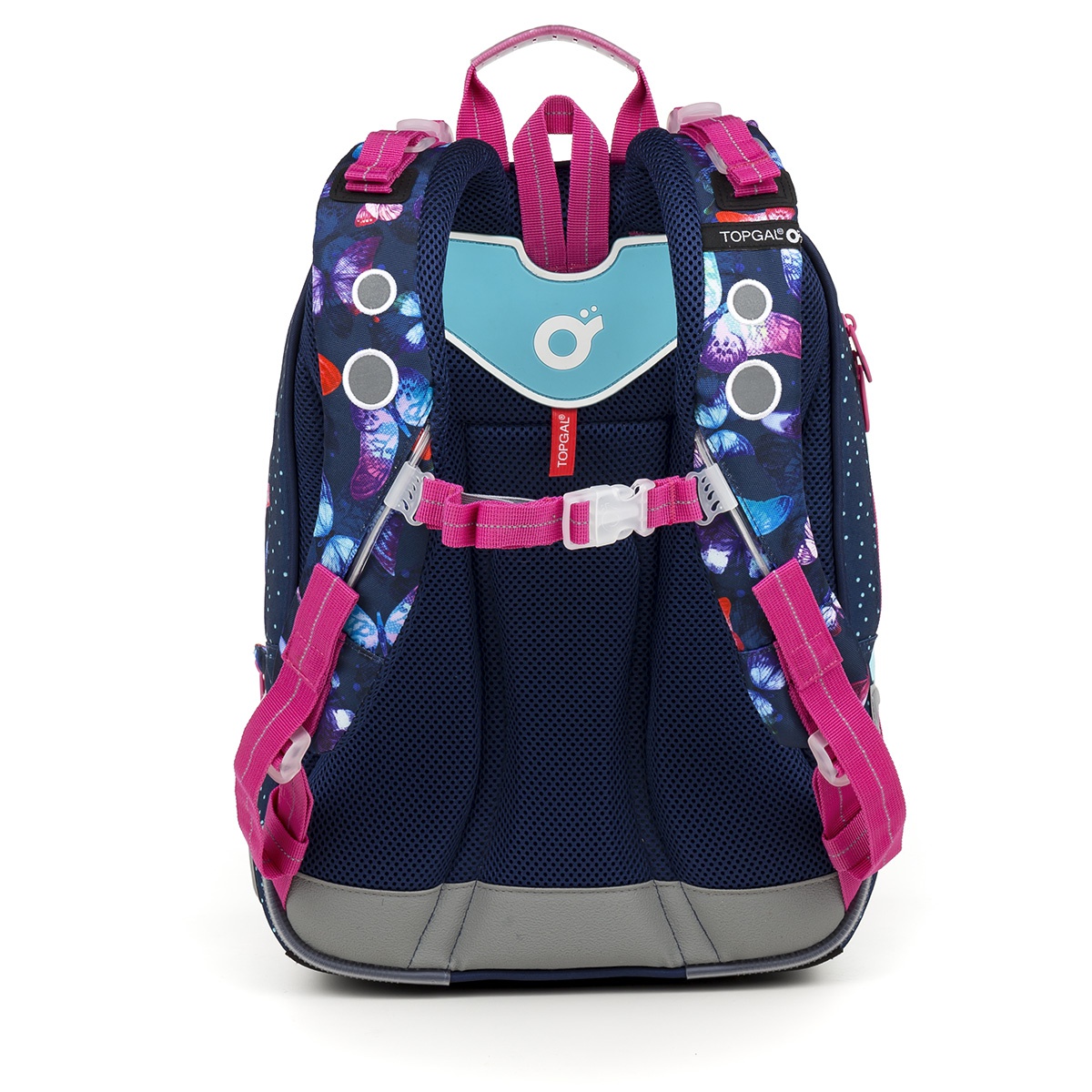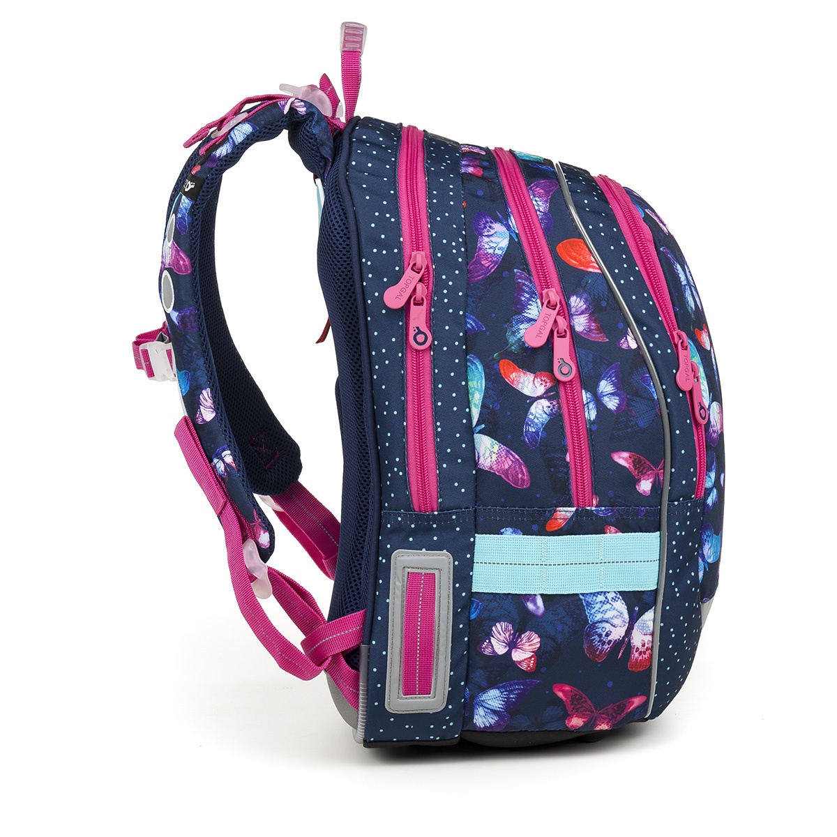- Přední hluboká kapsa je ideální na svačinku a je v ní navíc ukrytá ještě karabinka na klíče. Batoh má i boční kapsu na láhev. Reflexní prvky najdete na všech stranách batohu, tak jak je u batohů Topgal dobrým zvykem.