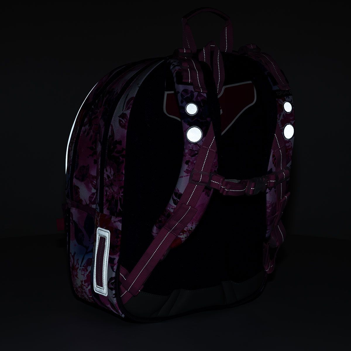 Lahvičku s pitím radíme umístit do síťové kapsy na boku batohu. Batoh KIMI je samozřejmě opatřen řadou reflexních prvků na všech jeho stranách tak, aby byla vaše školačka vidět i za špatných povětrnostních podmínek nebo za tmy v zimním období. Zkontrolovat si tuto skutečnost můžete v detailních fotkách, kde máme batoh vyfocený ve tmě.