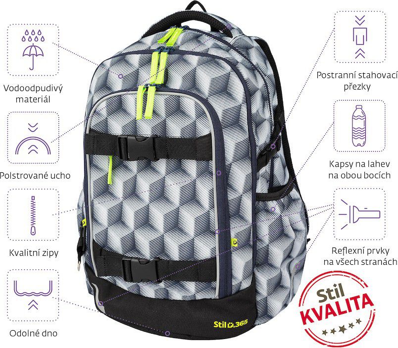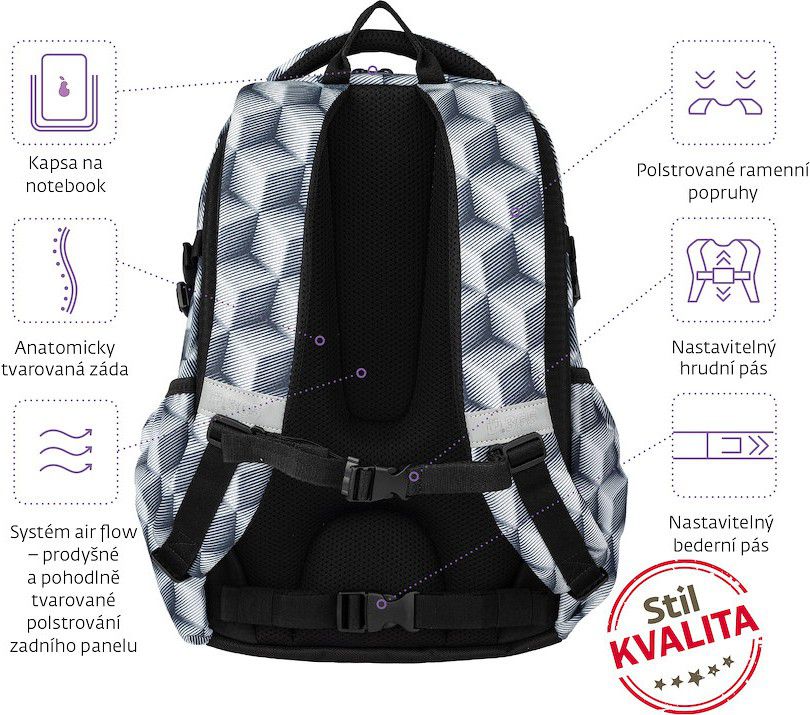 - Bezpečnostní prvky na všech stranách batohu