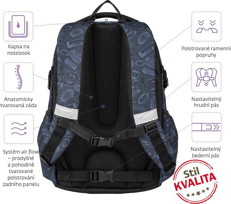 - Popruhy na přední kapse pro uchycení například mikiny na cestu domů ze školy
