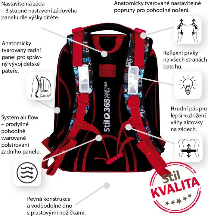 - 3D ZÁDOVÝ SYSTÉM – batoh perfektně sedí na zádech. Anatomický zádový panel se přizpůsobí páteři dítěte a systém Air Flow a prodyšné polstrování umožní cirkulaci vzduchu a příjemné nošení. Hrudní pás s kvalitní přezkou zajistí dobré usazení aktovky na zádech dítěte
