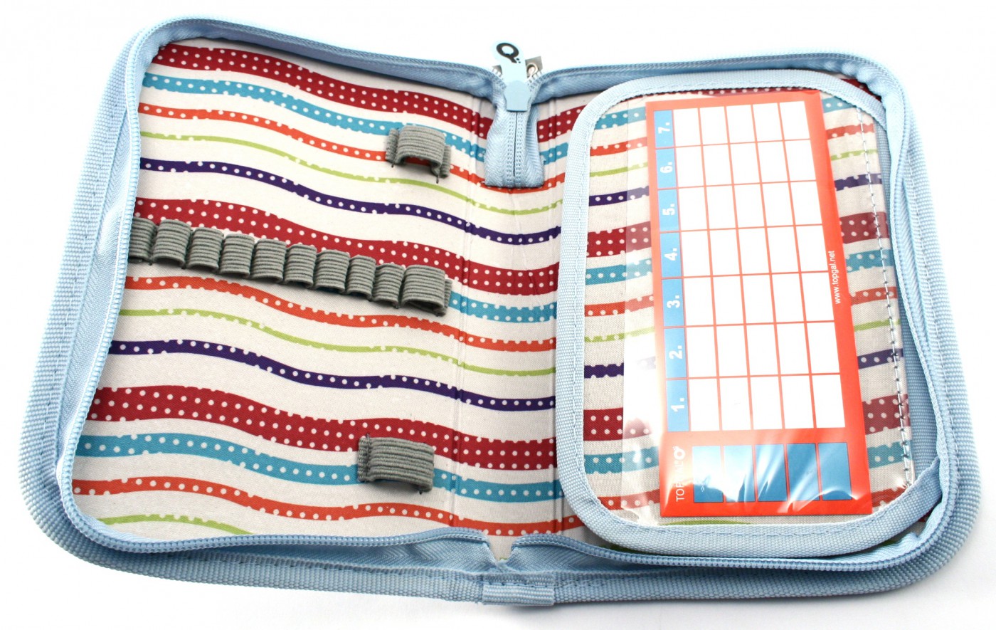 Uvnitř vybaven gumovými úchyty na psací potřeby a přepážkou s průhlednou folií a rozvrhem hodin.