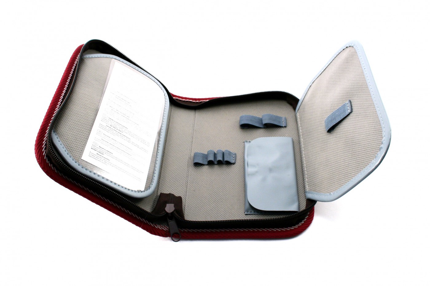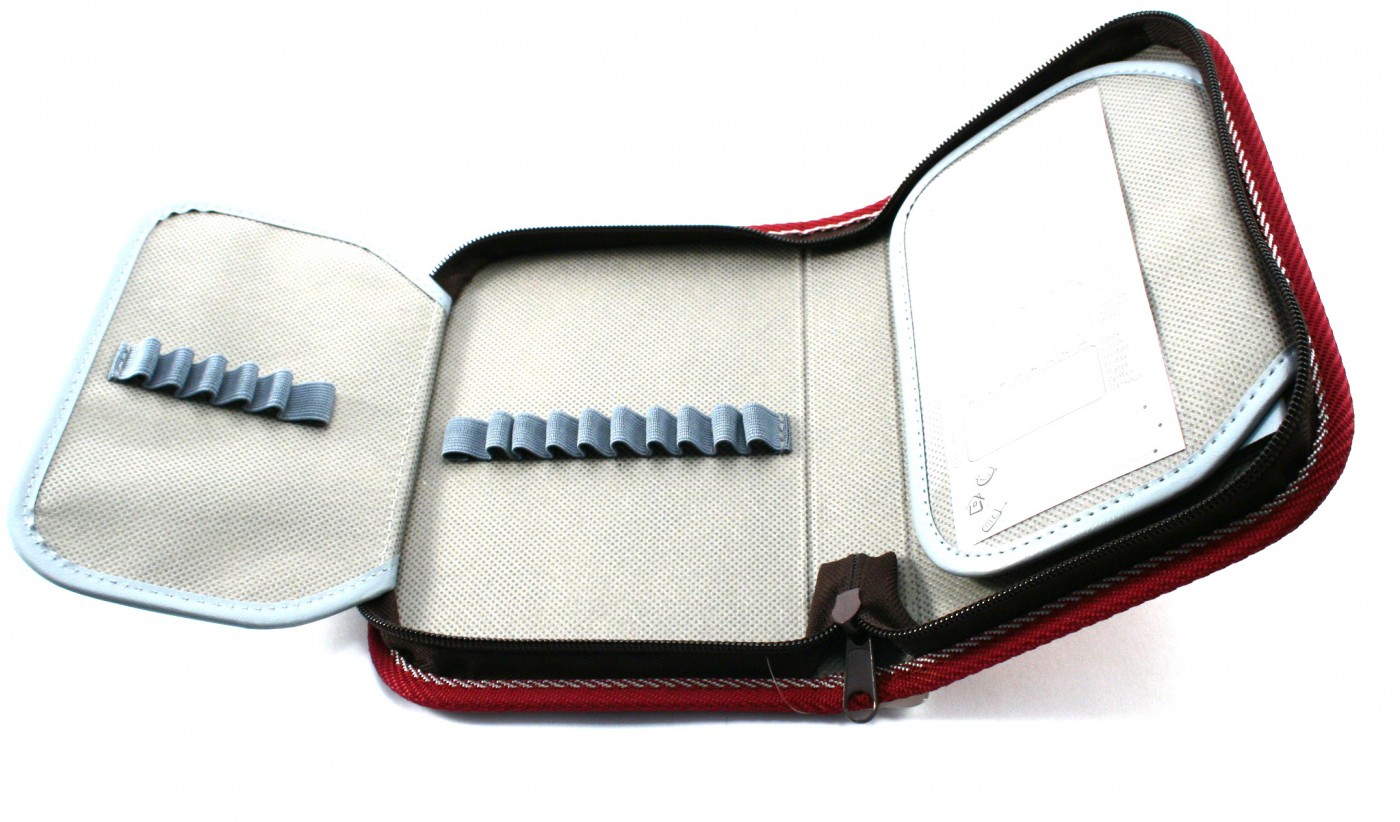 Uzavírá se na jeden samostatný zip. Má celkem 26 pružných gumových poutek pro uložení psacích potřeb. Na rubu obou klop má průhlednou přihrádku pro týdenní rozvrh se jmenovkou a pro rady spotřebitelům.