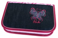 Uzavírá se na jeden samostatný zip. Má celkem 25 pružných gumových poutek pro uložení psacích potřeb. Na rubu klopy má průhlednou přihrádkou pro týdenní rozvrh se jmenovkou.
