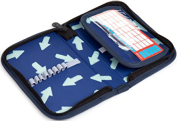 - Jednopatrové školní pouzdro, vybavené gumovými úchyty a přepážkou s průhlednou fólií a rozvrhem hodin.