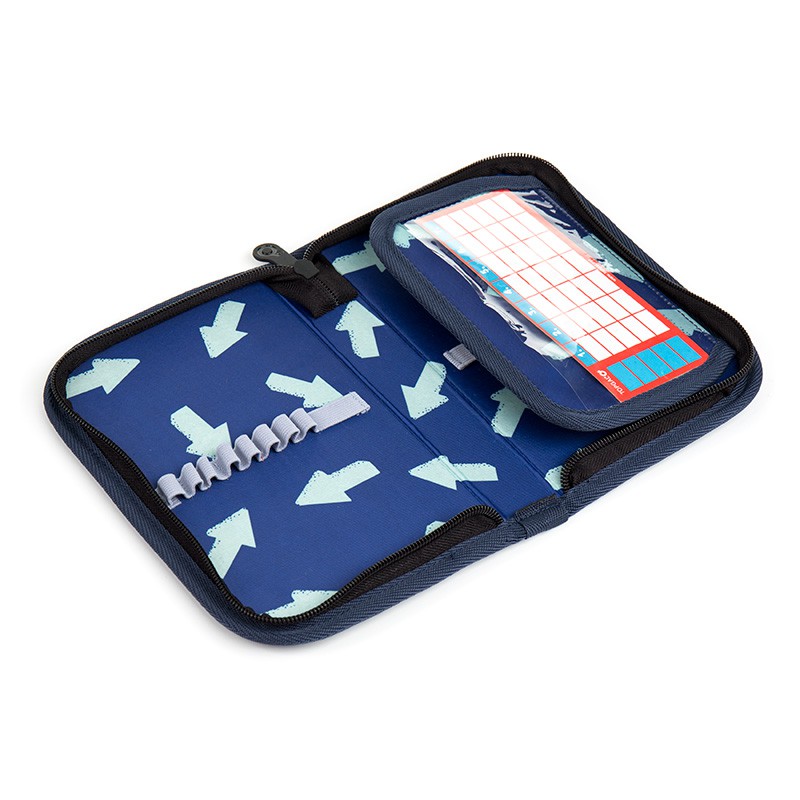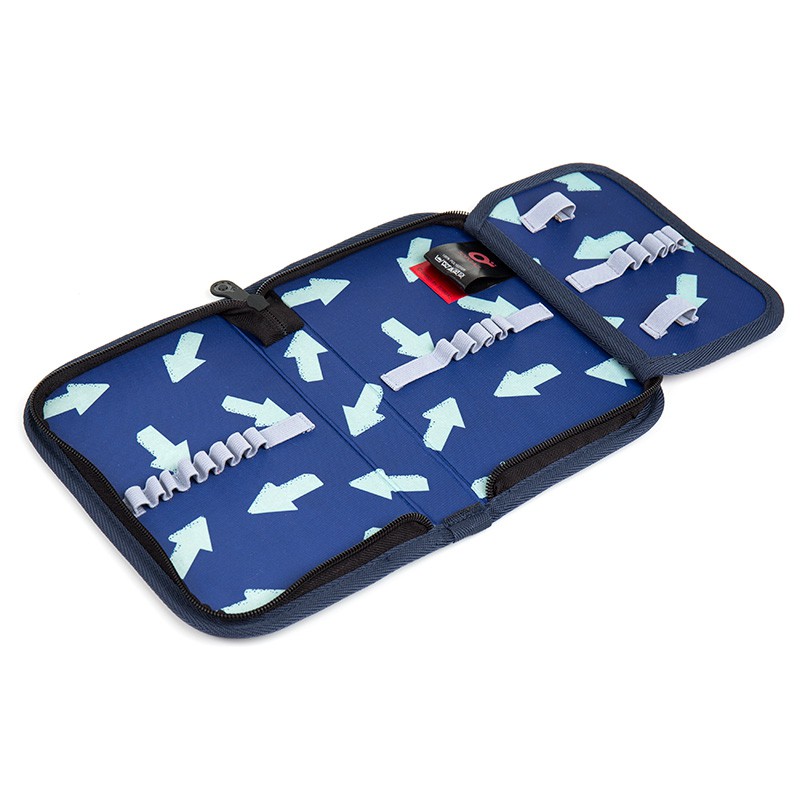 - Jednopatrové školní pouzdro je vybaveno osmnácti klasickými gumovými úchyty na pastelky a fixy, čtyřmi širšími úchyty na pravítka, kružítko či nůžky a dvěma většími úchyty na gumu a ořezávátko.