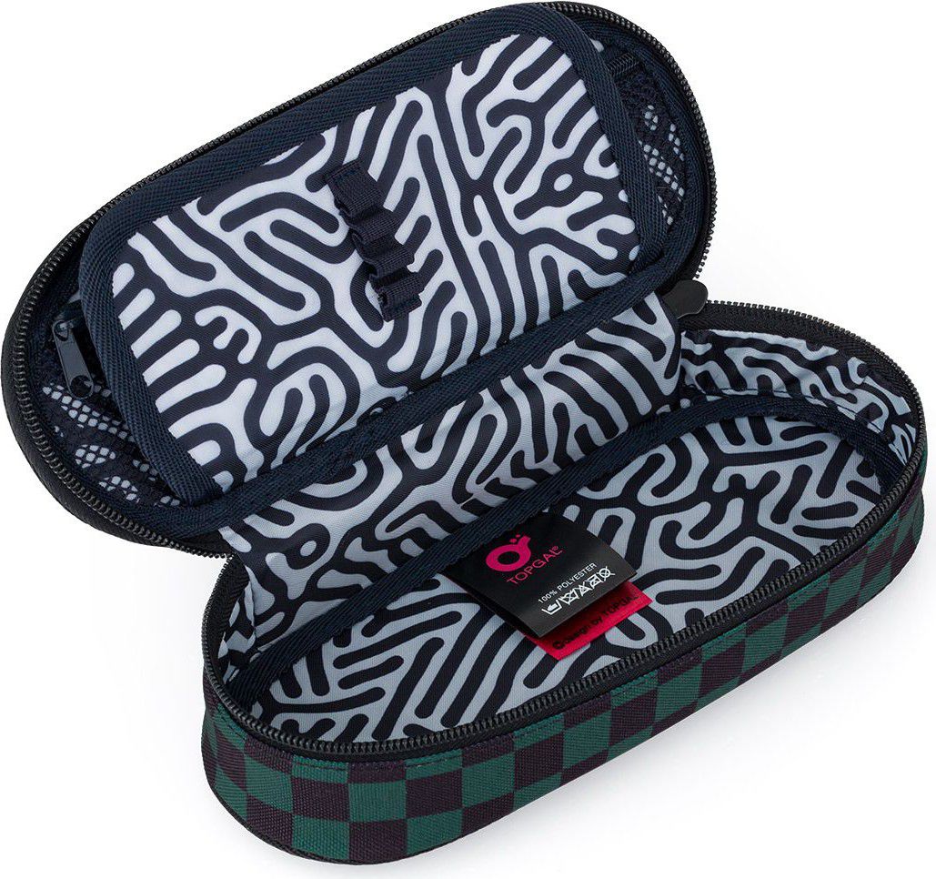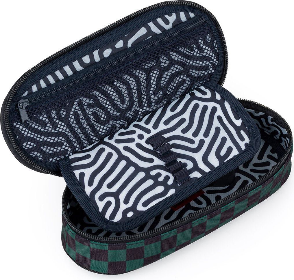 Oválný penál pro všechny starší školáky a studenty. Uvnitř pouzdra je síťová kapsička na zip a klopa s devíti gumičkami na propisky. Volný prostor pod klopou slouží pro další psací potřeby – pastelky, fixy, ale i pravítko nebo kružítko.