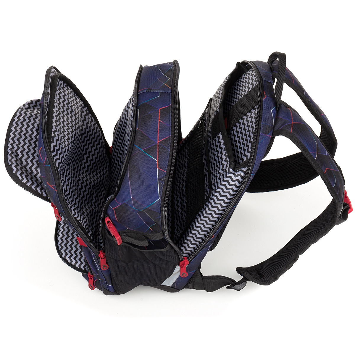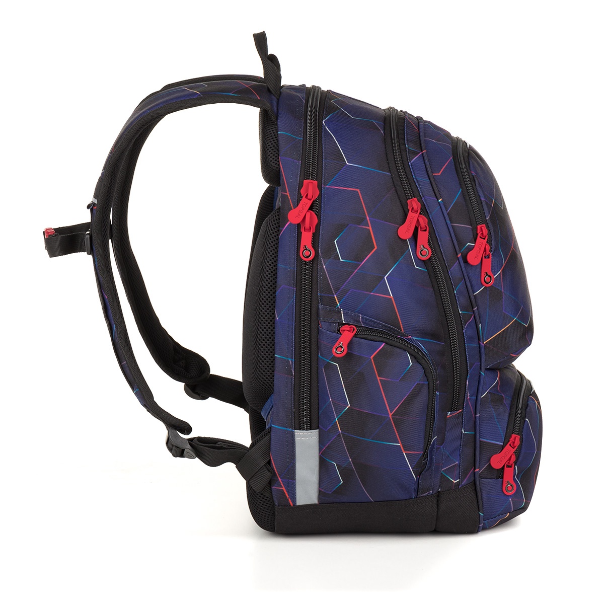 Přední komora je užší, nabízí další prostor pro uložení všech školních potřeb. Na jednom boku batohu potěší jednoduchá zipová kapsa na drobnosti, na druhém pak kapsa se síťkou, do které se vejde i větší PET lahev. Díky kompresnímu popruhu s přezkou ji k batohu jednoduše upevníte.