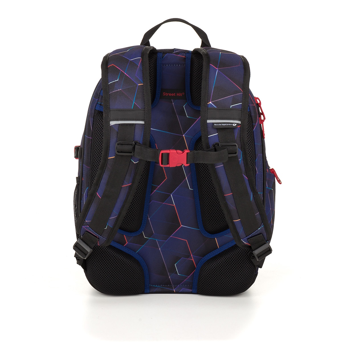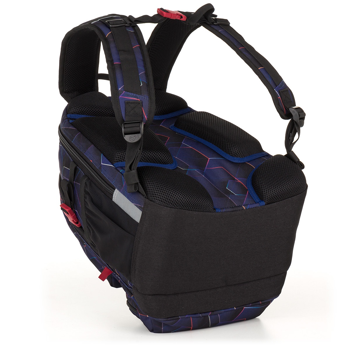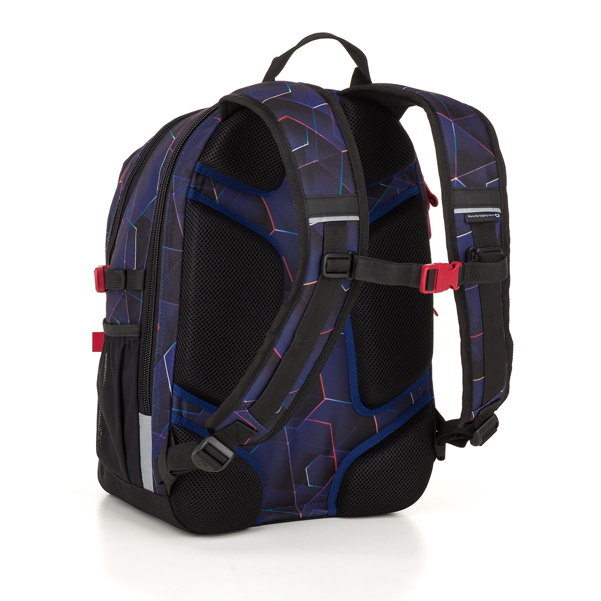 Zadní komora batohu je nejobjemnější. Najdete v ní polstrovanou kapsu pro bezpečné uložení notebooku do maximální velikosti 15,4”, který můžete upevnit páskem na suchý zip. Pokud do školy notebook nenosíte, nevadí. Kapsu můžete využít na přenášení složek, dokumentů nebo jiných písemností. Na polstrované kapse je pak našita ještě jedna malá síťovaná kapsa na zip, určená na drobnosti, nebo třeba na mobil.