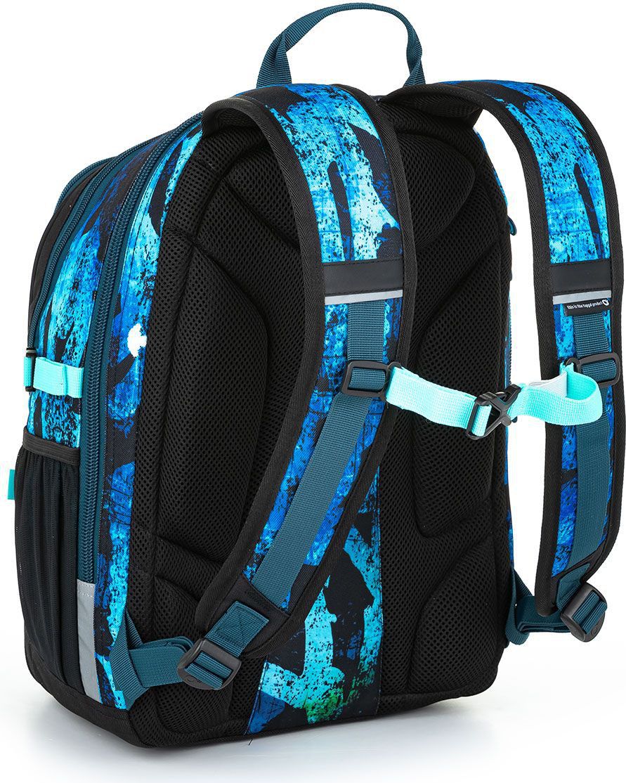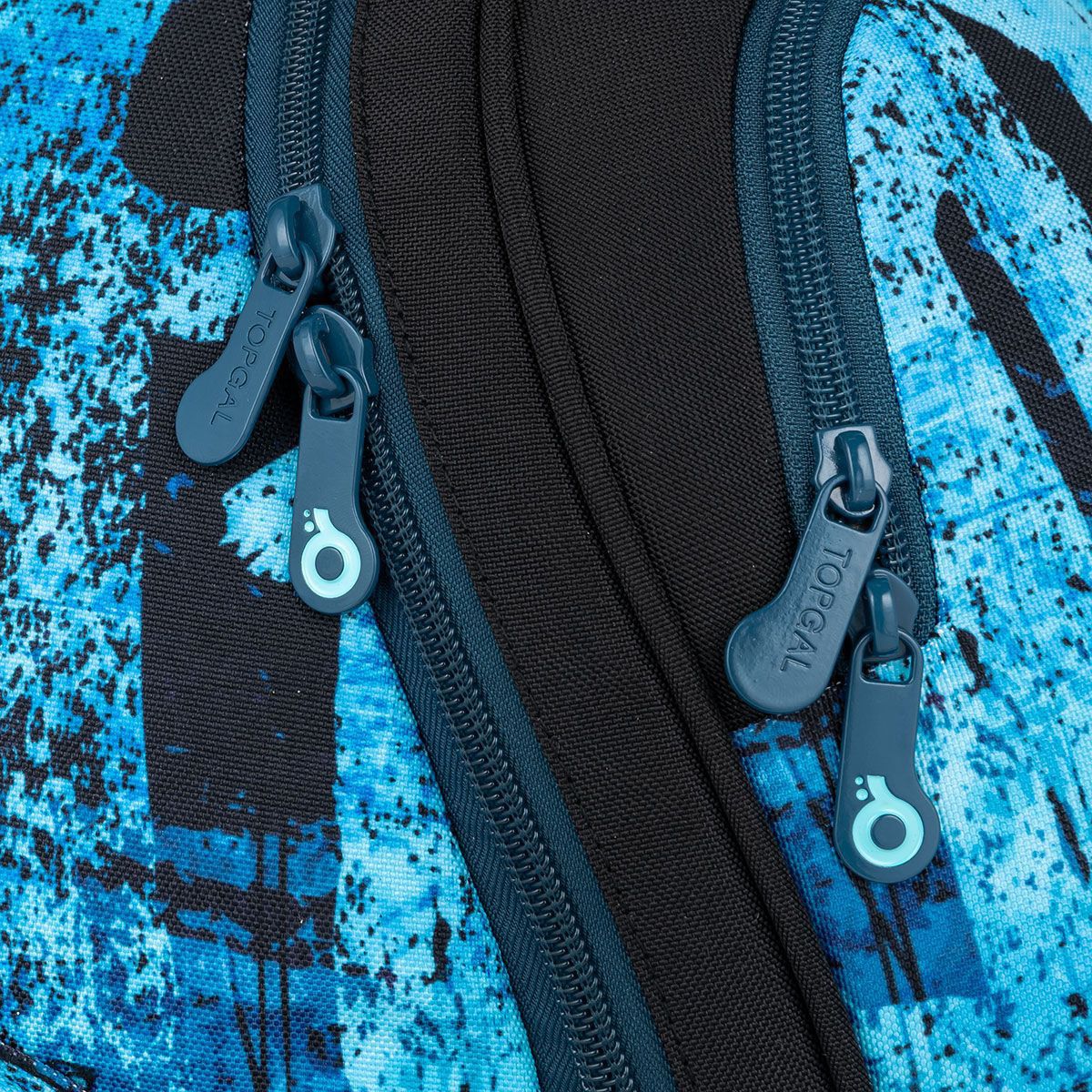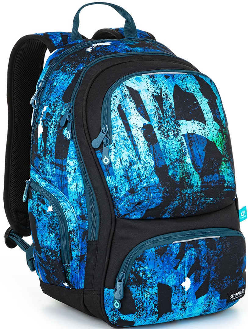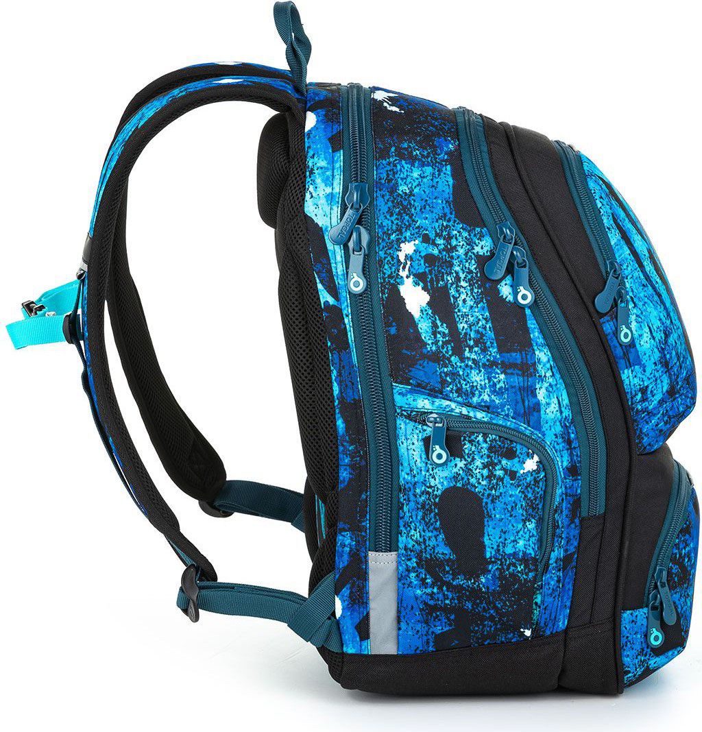 Dvě objemné komory pojmou všechno učení. Nejvíce se jej vejde do zadní objemné komory, ve které najdete i polstrovanou kapsu na notebook a menší polstrovanou kapsu, třeba na mobil. V přední užší komoře je pak ještě síťová kapsa na drobnosti a karabina na klíče v dlouhé pružence. Přední kapsy můžete použít na drobnosti, svačinu, nebo třeba na uložení pouzdra ETUE 22034 ve stejném designu.