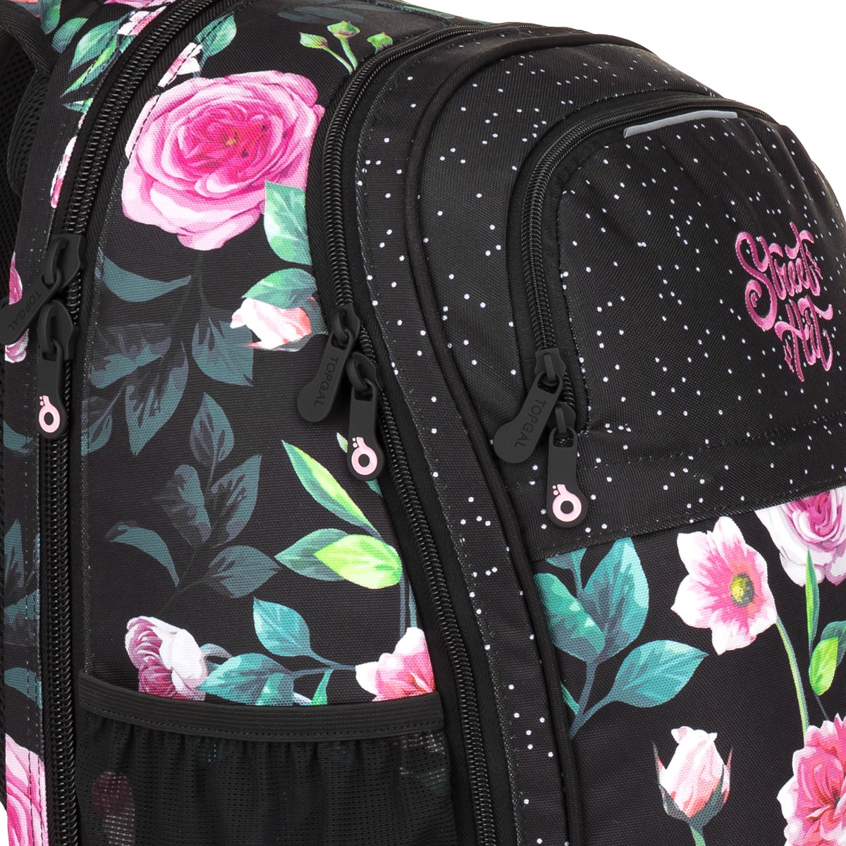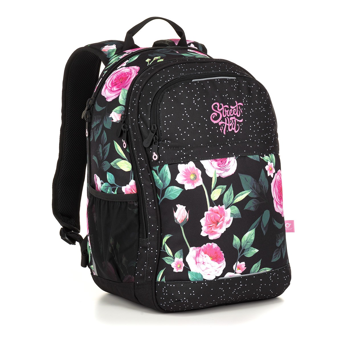 Hitovka pro všechny studentky je na světě! Představujeme zcela nový střih batohu s úžasným potiskem růží doplněných jemnými tečkami. batoh určitě poslouží nejen na každodenní cesty do školy, vejde se do něj vše nezbytné i na výlety nebo kroužky. Ani na studentských batozích nešetříme polstrováním a výztuhou zad. Ty jsou právě v období dospívání a s ním spojeným růstem zvlášť potřebné. Ergonomicky tvarované a výškově nastavitelné ramenní popruhy jsme navíc doplnili posuvnou hrudní přezkou, která ulehčí váze batohu.