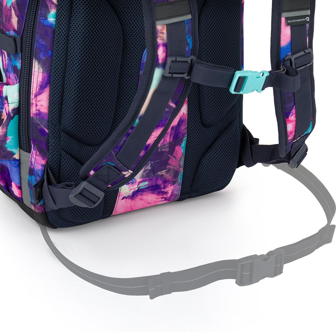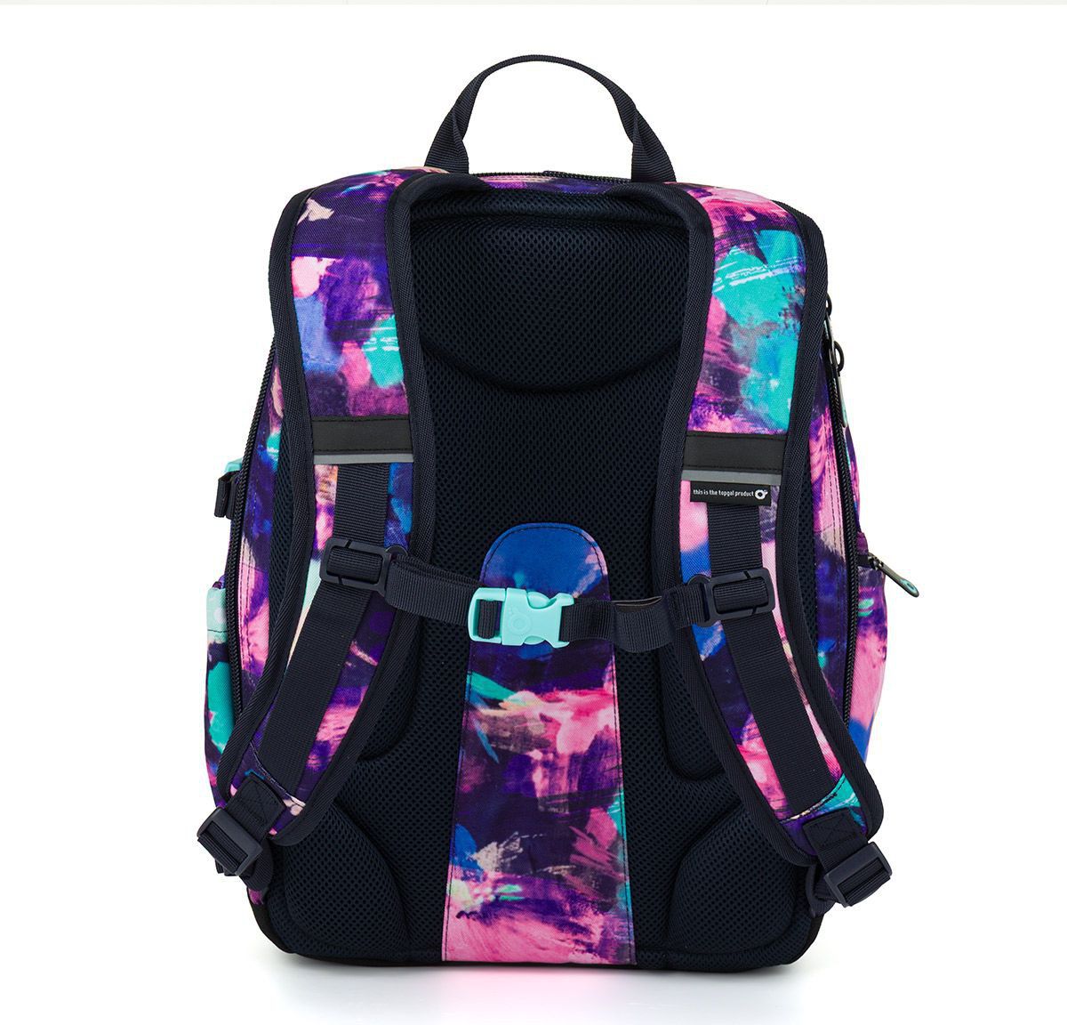Dvoukomorový batoh s moderním abstraktním motivem v sytých odstínech růžové, fialové a tyrkysové. Záda batohu jsou polstrovaná a anatomicky tvarovaná z měkké pěny. Uvnitř zadní komory je umístěna polstrovaná kapsa na notebook i tablet.