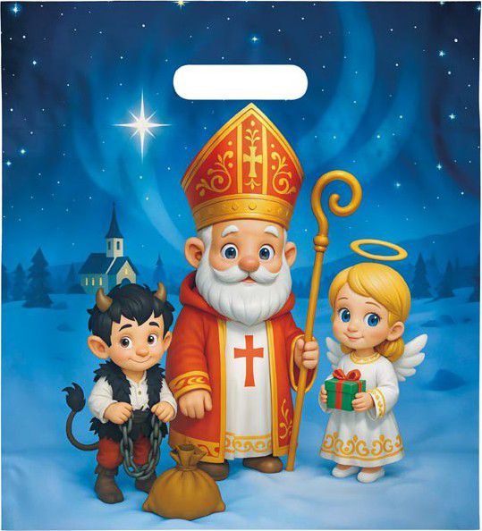Taška MFP Mikuláš M – pohádkové balení sladkostí i dárků Mikulášská nadílka má být plná radosti – a přesně o to se postará taška MFP s motivem Mikuláše, anděla a čerta. Krásně ilustrovaný obrázek působí jako z pohádky a dětem okamžitě vykouzlí úsměv na tváři. A to není všechno. Díky své velikosti taška pojme pořádnou mikulášskou nadílku – od čokolád a perníčků přes ovoce až po malé hračky. Nemusíte se trápit s balicím papírem, protože krásný motiv tašky udělá parádu sám o sobě. Materiál: PE Rozměr: 300 x 320 x 80 Praktické balení: odtrhávací blok Uvedená cena je za 1 ks.