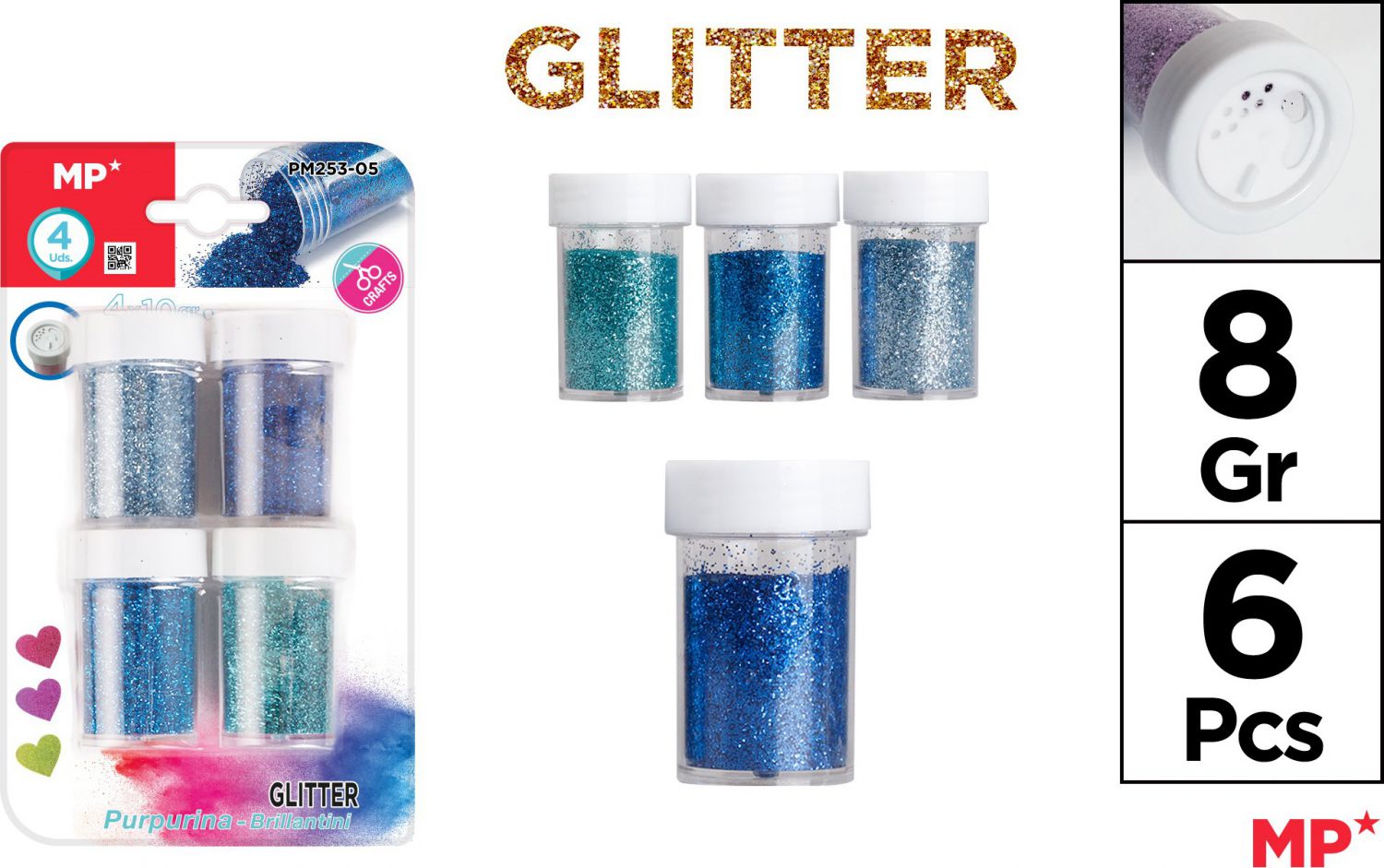 - Sada obsahuje 4ks balení třpytek v barevném mixu (tmavě modrá, modrá, světle modrá, tyrkysová).