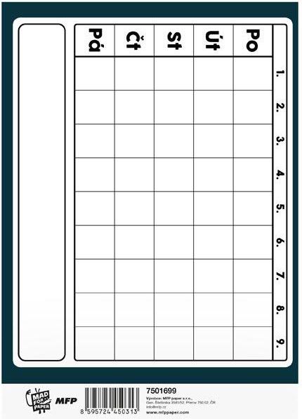 Mít všechny školní úkoly a poznámky na jednom místě usnadňuje každodenní přípravu do školy. Tento úkolníček MFP ve formátu A5 poskytuje dostatek prostoru pro všechny tyto zápisy. Motiv fotbalových dresů na obálce přináší sportovní atmosféru a osloví všechny malé fotbalisty. Díky oblíbenému motivu budou děti zapisovat úkoly s větší chutí a snáz si vytvoří návyk mít vše důležité přehledně zaznamenané. ÚKOLNÍČEK OBSAHUJE: - osobní údaje - telefonní čísla - prostor pro poznámky - malou násobilku - geometrické a matematické vzorce - vyjmenovaná slova - rozvrh hodin Formát: A5 Počet stran: 40 Motiv: fotbalové dresy Uvedená cena je za 1 ks.