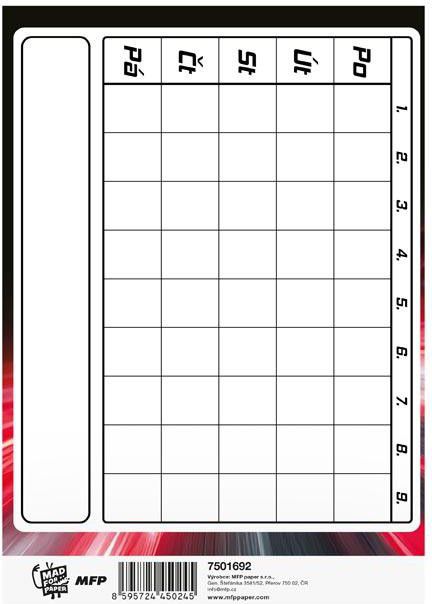 Školní den má někdy tempo jako závodní okruh – a právě proto je dobré mít všechny úkoly a poznámky přehledně na jednom místě. Tento úkolníček MFP s motivem formule je navržený tak, aby se stal spolehlivou součástí každodenní školní výbavy. Formát A6 je kompaktní a praktický. Stránky mají dost prostoru na zápisy a jejich přehledné členění usnadňuje orientaci. ÚKOLNÍČEK OBSAHUJE: - osobní údaje - telefonní čísla - prostor pro poznámky - malou násobilku - geometrické a matematické vzorce - vyjmenovaná slova - rozvrh hodin Formát: A6 Motiv: formule Počet stran: 40 Uvedená cena je za 1 ks.