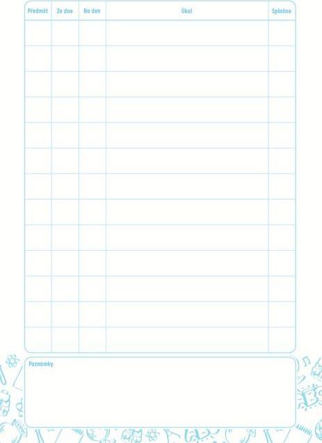 Aby se na žádný domácí úkol nezapomnělo. Tento školní úkolníček s motivem veverky je jednoduchý a praktický pomocník pro každý školní den – místo, kam si děti přehledně zapíšou zadání z hodin i další důležité poznámky. Praktický formát A6 se snadno vejde do školní aktovky a nezabere mnoho místa. Přehledné uspořádání pomáhá žákům udržet si pořádek v zadaných úkolech a mít jasno v tom, co je potřeba připravit na další den. ÚKOLNÍČEK OBSAHUJE: - osobní údaje - telefonní čísla - prostor pro poznámky - malou násobilku - geometrické a matematické vzorce - vyjmenovaná slova - rozvrh hodin Formát: A6 Počet stran: 40 Motiv: veverka Uvedená cena je za 1 ks.