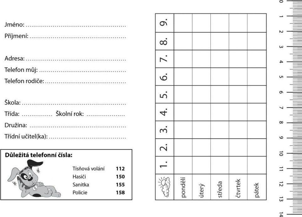 Školní deníček – úkolníček ve formátu A6 s rozvrhem hodin s možností zapisování úkolů a poznámek.